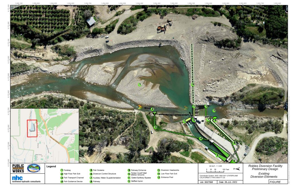 The Robles Diversion and Fish Passage Facility (Robles or Facility) is located on the Ventura River 2.3 miles downstream of the Matilija Dam. The Facility includes a 10-foot high diversion dam, forebay, fish ladder, intake screens, control gates, and the top section of a 4-mile long concrete channel known as the Robles-Casitas Canal.
