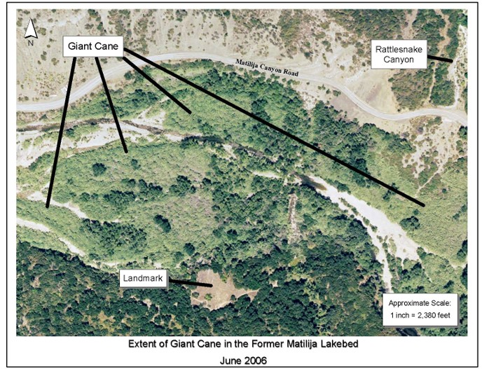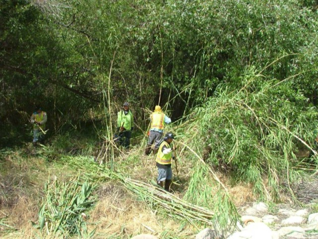 The Matilija Creek Giant Reed Removal Project was initiated by Watershed Protection District (WPD) in 2007 with a State Water Resources Control Board grant to improve habitat quality and to reduce flood and fire risks in advance of Matilija Dam removal. Non-native plants, including giant reed (Arundo donax), have been removed or re-treated approximately 1-3 times per year since 2007, allowing native plants to re-colonize the floodplain ecosystem. More than 1,200 acres upstream of SR 150 along 15 river miles of the Ventura River and Matilija Creek. In mid-2025 the program transitioned from WPD to the Ojai Valley Land Conservancy (OVLC) for expanded implementation under a multi-year, watershed-scale CalFIRE grant.